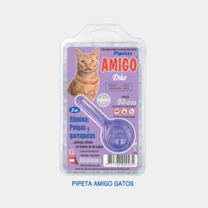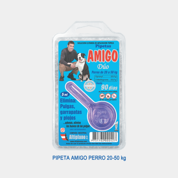 AMIGO DUO solución cutánea de aplicación topical, está indicado para el tratamiento y control contra las pulgas, piojos y garrapatas en perros, eliminando la pulga adulta, e impidiendo el desarrollo de los huevos, larvas y pupas resultantes de las pulgas adquiridas. AMIGO DUO, no evita el contacto de las garrapatas en el perro, pero estas mueren durante primeras 24 horas posteriores a su adhesión, antes de que llegue a chupar la sangre y puedan transmitir enfermedades. Una vez muerta, las garrapatas suelen desprenderse, en caso contrario puede eliminarse fácilmente retirando de ellas con suavidad.